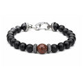 This bracelet is built around a centerpiece that features a bead crafted from 100 million year-old dinosaur bone found in the American West. Every bead, by the very nature of the extraordinary material, is unique in pattern and color. Flanked by sterling silver and frosted black onyx and with a comfortable and secure sterling clasp system. Whether you are in denim or business attire, the 'Gentis' wears beautifully and adds your own distinct style. Great on its own or layered with other piece