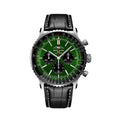 This Breitling Navitimer 46 Mm With An Automatic Movement Features A Stainless Steel Case And An Inside Bezel. This Chronograph Watch Also Features A Green Dial With A Presentation Back. The Watch Comes On A Black Alligator Strap With A Folding Clasp.