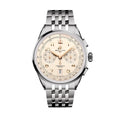 Premier B01 Chronograph in 42mm from Breitling. Crafted in stainless steel with a tone-on-tone cream colored dial with Arabic numeral markers. 100% manufactured in Switzerland in stainless steel with the renowned B01 movement that has a 70 hour power reserve. Re-designed from the 1940s this functional and elegant watch features a vintage style with a fixed high-polished bezel.