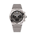 This Breitling Chronomat features a 42 mm titanium case and the iconic bezel with the four rider tabs, anthracite dial, and the signature “Rouleaux” bracelet made of titanium. The watch is powered by the in-house Breitling Manufacture Caliber 01, a COSC-certified chronometer.