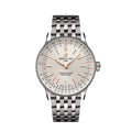 A feminine re-imagination of the classic Navitimer, the Pilot's watch in 36mm. A white dial with rose gold indices, hands and second hand. Features a delicate beaded, but still functional bi-directional bezel with slide-rule functionality. Fixed to a 7-row stainless steel bracelet. Water resistant to 50 ft.