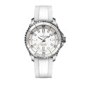 Aside from looking good, the new Breitling Superocean Automatic watch is a technical marvel. At 300 meters (1000 ft) water resistance, this watch triples the minimum requirement for dive watches. This 36mm model features a white dial and matching white rubber strap with a folding clasp that allows for micro adjustments of up to 15mm for easy wear over rash guards and dive suits. Its scratch proof, unidirectional, ceramic inlayed bezel means it will never wear or fade. This watch is also shock, sand, and saltwater resistant. Its automatic Breitling Caliber 17 comes with a two year warranty and approximate 38 hour power reserve.