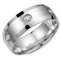This contemporary white gold wedding band with beveled edges and a brushed center featuring six diamonds 0.23cttw in a bezel setting is a modern classic.
