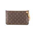 LOUIS VUITTON Monogram Neverfull MM GM Pochette in Pivoine. Made for those everyday essentials, this pouch is crafted of traditional Louis Vuitton monogram coated canvas with a vachetta wristlet and gold hardware. The top zipper opens to a striped pink fabric interior with a patch pocket.