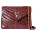 This elegant shoulder tote features chic chevron quilted calfskin leather in burgundy. The bag has silver chain-link shoulder straps with matching leather shoulder pads. The frontal flap features a prominent silver YSL monogram detail and opens to a partitioned black fabric interior with zippered pockets.