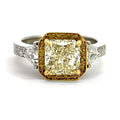 18K and platinum ring with a 2.20ct fancy yellow diamond surrounded in a halo of yellow diamonds. The sides are set with 2 trillion cut diamonds (0.56cttw) and an accented diamond band.