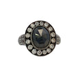 18k white gold with black rhodium vintage halo ring with an oval cut black diamond and brilliant white diamonds.