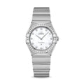 This 28 mm stainless steel model features a diamond-paved bezel, white mother-of-pearl dial with diamond hour markers and scratch-resistant sapphire crystal. The hands, OMEGA logo, Constellation star and diamond holders are in 18K white gold.