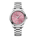 The shell pink dial, fashioned from brass, is lacquered and sun-brushed from the centre. The date window at 6 o'clock, hands, indexes and OMEGA logo are in diamond-polished 18K white gold.