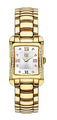 ESQ by Movado Ladies watch from the Verona Collection. 35mm x 23mm rectangular, highly polished, gold plated stainless steel curved case with diamonds. Swiss quartz movement. Sapphire crystal. White color Mother-of-Pearl dial with Sunburst textured rectangle inside, Roman and diamond markers. Polished gold plated stainless steel bracelet.