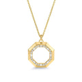 14K yellow gold, the necklace is Inspired by the beauty of underlying structure, the Octave Diamond Baguette necklace is innovative and fun. Featuring a hex halo at it's core, and dimensional structure inspired by the architectural truss, this is a statement in the making. 0.64cttw