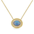 14K yellow gold pendant necklace with one oval cut opal 0.90cttw and a halo of diamonds. 0.18cttw.