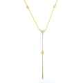 18K yellow gold Y necklace with a diamond and gold triangle at 18" and a 3" drop with a dangling gold bar. Bezel set diamonds accent the chain. 0.36cttw
