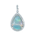 14K white gold pendant with a 3.22cttw pear shaped opal with flashes of green and orange, surrounded in a halo of diamonds 0.43cttw. Chain sold separately.