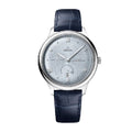In this 41 mm stainless steel model, the domed PVD light blue dial features a stamped random vertical pattern in a sun-brushed finish. The display is distinguished by rhodium-plated hands, as well as alternating Roman numerals and cabochon indexes.