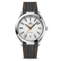 The silvery dial is distinguished by a horizontal “teak” pattern which is inspired by the wooden decks of luxury sailboats. There is also a date window at 6 o'clock and blackened hands and indexes filled with white Super-LumiNova. Orange is used for the central seconds hand, the "Seamaster" wording and the four quarter numbers on the minute track.