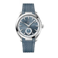 The sun-brushed blue-grey dial is distinguished by a horizontal “teak” pattern, along with a date window at 6H and an opaline Small Seconds subdial featuring a rhodium-plated ring. The design is further complemented by rhodium-plated hands and indexes filled with white Super-LumiNova, as well as sandblasted minutes and seconds tracks on the dial and subdial.