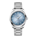 The sun-brushed dial, in OMEGA’s own Summer Blue, is PVD-treated and varnished with a gradient finish to reflect the watch’s level of water resistance. It has rhodium-plated hands and sailboat hull indexes filled with a unique light blue Super-LumiNova and a matching blue date window indicator at 6 o’clock.