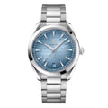 The teak pattern dial, in OMEGA’s own Summer Blue, is sun-brushed, PVD-treated, and varnished with a gradient finish to reflect the watch’s level of water resistance. It has rhodium-plated hands and indexes filled with a unique light blue Super-LumiNova and a matching blue date window indicator at 6 o’clock.