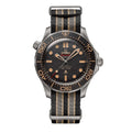 Slightly slimmer than the standard Diver 300M models thanks to the doming of the sapphire-crystal glass, it is presented on a striped NATO strap in brown, grey and beige with 007 engraved on a titanium loop.
