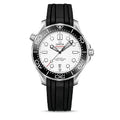This 42 mm model is crafted from stainless steel and includes a black ceramic bezel with a white enamel diving scale. The dial is polished white ceramic and features laser-engraved waves and Seamaster highlighted in red.