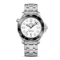 This 42 mm model is crafted from stainless steel and includes a black ceramic bezel with a white enamel diving scale. The dial is polished white ceramic and features laser-engraved waves and Seamaster highlighted in red.