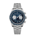 This 43 mm model is crafted in stainless steel with a blue dial with silvery subdials. Along with a blue anodized aluminium bezel ring with its tachymeter scale, the leaf-shaped hands and Arabic numerals are rhodium-plated, with a unique “spiral” track pattern running beneath the numbers.