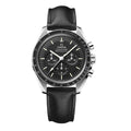 Presented on a black leather strap, this 42 mm Moonwatch in stainless steel features sapphire crystal glass on the front as well as on the caseback. Inspired by the 4th generation Speedmaster style worn on the moon, it also includes an asymmetrical case, black step dial with applied OMEGA logo and the famous dot over 90 on the anodised aluminium bezel ring.