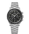 Presented on a polished-brushed five-arched-links-per-row bracelet, this 42 mm Moonwatch in stainless steel features sapphire crystal glass on the front as well as on the caseback. Inspired by the 4th generation Speedmaster style worn on the moon, it also includes an asymmetrical case, black step dial with applied OMEGA logo and the famous dot over 90 on the anodised aluminium bezel ring.