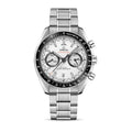 On the white dial, there is a distinctive racing style minute-track which gives the watch its name. There are also two subdials with blackened applied rings as well as a 6 o’clock date window that blends with the colour of the dial. The hour and minute hands and arrowhead indexes are blackened with white Super-LumiNova. Orange touches include the "Speedmaster" name and the tip of the central seconds hand.