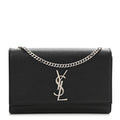 SAINT LAURENT Grain De Poudre Small Monogram Kate Satchel in Black. This stylish shoulder bag is crafted of black textured leather. The bag features a silver chain-link shoulder strap with a silver YSL logo on the front flap. This opens to a black leather interior with a card slots, flat pockets and a zipper compartment.