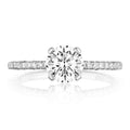 18K white gold engagement ring with a prong set round center stone on a diamond band featuring diamonds set halfway along the polished band, accented by milgrain detailing and signature Tacori openwork with diamonds on the sides and bottom. Total diamond weight 0.23cts.