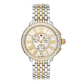 This Serein two-tone diamond watch timepiece features a chronograph movement, 123 brilliant hand-set diamonds (0.62 carat weight) along the bezel and white mother-of-pearl dial. Paired with a seven-link two-tone stainless and 18k gold-plated bracelet, this 18mm bracelet is made specifically for the Serein and is interchangeable with any 18mm MICHELE strap.
