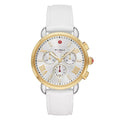 Designed with a modern silhouette, the Sporty Sport Sail features a chronograph movement, eye-catching two-tone yellow gold case, silver sunray dial with Roman numeral indexes and white silicone strap perfect for everyday wear. The 18mm silicone strap is made specifically for the Sporty Sport Sail Collection and is interchangeable with any 18mm MICHELE strap.