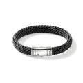 10mm woven black rubber bracelet from John Hardy with a sterling silver pusher clasp for secure closure with engraved design. Our most iconic design distills the complex art of chain-weaving into a stunningly simple form. Size Large
