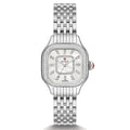 Rounded corners add modern elegance to the 27mm case of MICHELE's stunning Meggie watch that sparkles with 64 hand-set diamonds on the top ring in our signature MW pattern and a mother-of-pearl dial with diamond inner ring and signature diamond indexes. This watch features a Swiss three-hand movement and a gleaming 14mm seven-link stainless steel bracelet made specifically for the Meggie collection interchangeable with any 14mm MICHELE strap.